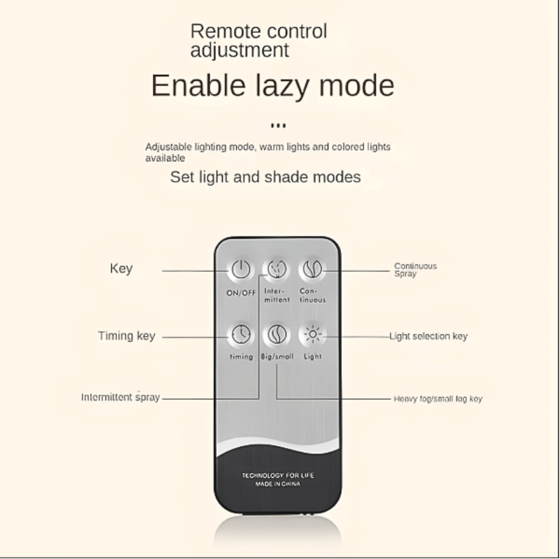 Powered by whisper-quiet ultrasonic technology, it operates smoothly in the background, and with the included remote control, you can effortlessly adjust mist intensity, switch between timer modes, and cycle through calming light colours—all from the comfort of your bed, couch, or workspace. Thanks to the auto shut-off timer you can even leave it running while you fall asleep!
